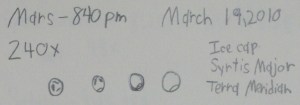 With the Moon moving towards the horizon, making viewing conditions less than ideal, Mars, high in the sky this time of year, became the next target on my hit list for the night. Mars has been hit and miss for me over the past couple observations. Some nights have revealed amazing land detail while others have left me underwhelmed. Tonight was somewhere in the middle. While Mars is still visible as a sphere, it is moving at such a fast rate away from Earth that observing land detail on it will be near impossible in the next couple months. Tonight, Mars revealed its Southern Ice Cap as well as the always interesting Syrtis Major and Terra Meridian land features. At 120x magnification, detail could be made concerning the ice cap with some slight hints of the two land features. Moving up to 240x revealed a more blurry Mars but also split seconds of good seeing conditions that revealed Syrtis Major and Terra Meridian.