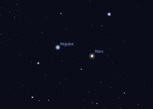Looking up into the night sky over the next few evening will provide a splendid treat for those interested in somewhat rare space happenings.  From now until June 10, Mars and Regulus appear to be on a collision course (in actuality Regulus is 77 light years away from Mars).  As Mars approaches Regulus, they will appear closer and closer until Mars passes and moves away from its celestial neighbor.