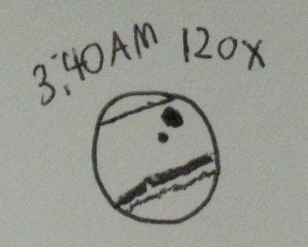Earlier views of Jupiter around 3:00am had shown the basic cloud belts, but its fast 10 hour rotation (Jupiter day) brought about new features quickly.  With a size between two and three times that of Earth, it is the largest storm in the solar system.  Over the past couple hundred years the GRS has varied in size and faded in and out but has constantly remained one of the most interesting features to view in the solar system.  To help with observing, I found putting half of a polarizing filter on my eyepiece cut down on the glare (I’ve also found that a full polarizing filter works as well and can be adjusted to best effect).  This reduction in brightness, brought much needed contrast that allowed another smaller blob to pop into view just to the lower left of the more massive GRS.  I’m not sure if this was Red Junior (GRS’ little son) or just a random cloud system near by.  Another first, came from noticing the inconsistencies of the cloud belts.  What had appeared as straight lines in the past revealed themselves to be imperfect clouds with wrinkles and folds.  Finely tuned optics, enough cool down time and waiting for pristine moments of atmospheric conditions will help to reveal details such as these .  Excited at seeing this type of detail at 120x magnification, I went inside and brought out a notepad to sketch the features I could make out.